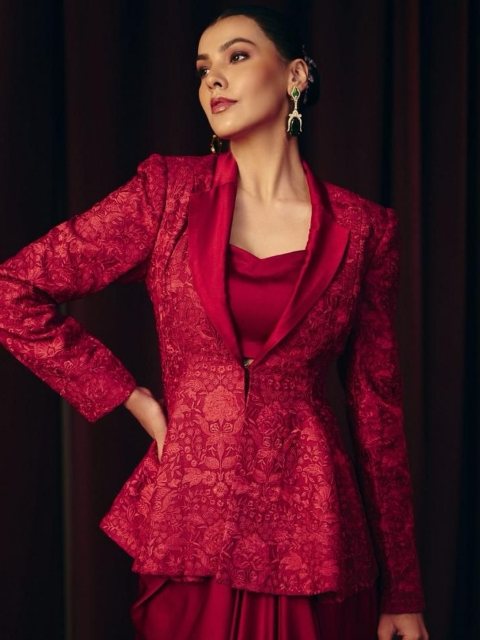 The label also turns up the drama with bold statement reds. The Vrinda Sharara Suit showcases paisley embroidery with tiered sharara movement, while the Nagama Drape Set fuses tailored peplum precision with satin drape fluidity for a powerful couture edge. Meanwhile, the Fitoor Fish Cut Lehenga and Maria Chantella Fish Cut Lehenga highlight sculpted silhouettes, crystal detailing, beadwork, and graceful trails that command attention at high-fashion Valentine moments.